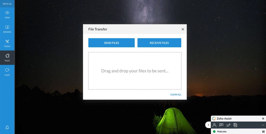 A transferência de arquivos durante uma sessão ao vivo ajudará você a enviar atualizações, patches ou qualquer tipo de arquivo para o computador remoto. A transferência é completamente segura com a criptografia AES SSL de 256 bits.