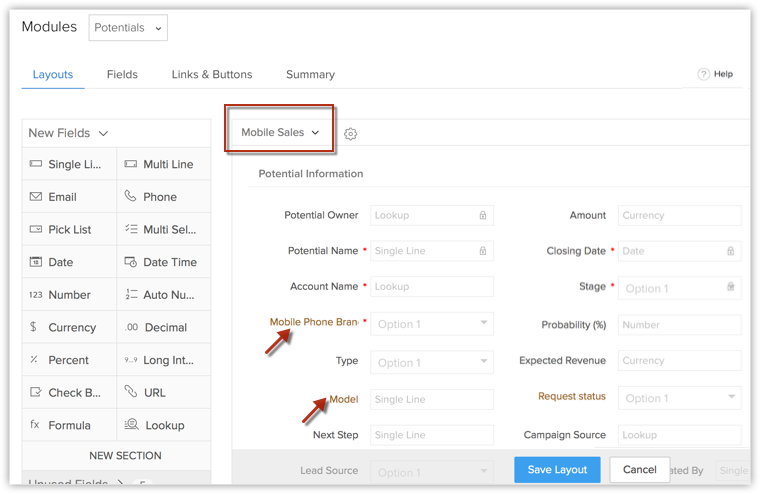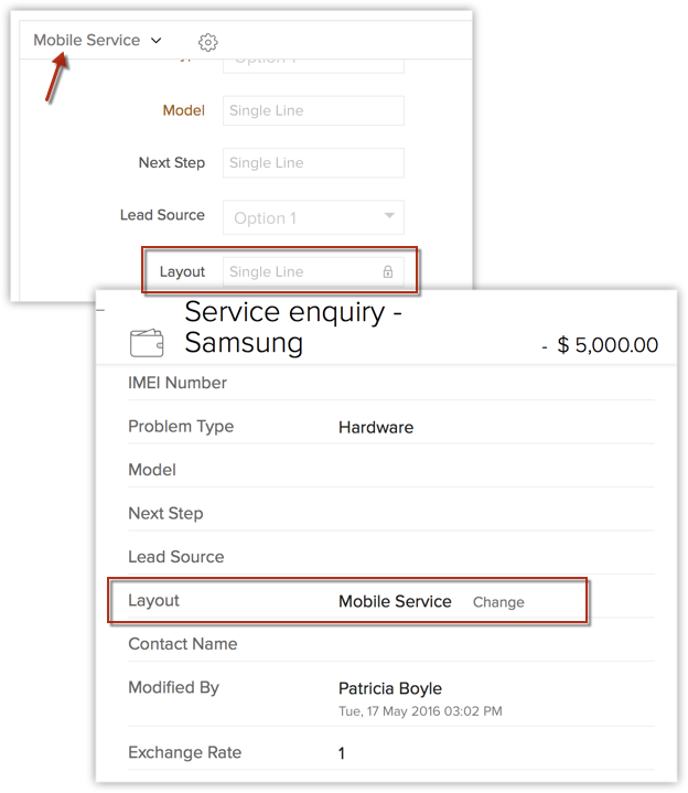 Dito isto, pode haver processos que são comuns a ambas as vendas móveis e serviços, bem como, tais como testes de qualidade e demonstração do produto. Portanto, a criação de módulos diferentes para vendas móveis e serviço seria um aborrecimento, como os módulos teriam informações e processos associados redundante. Dê uma olhada em como Zoho CRM aborda estas necessidades diversas com layouts de páginas.