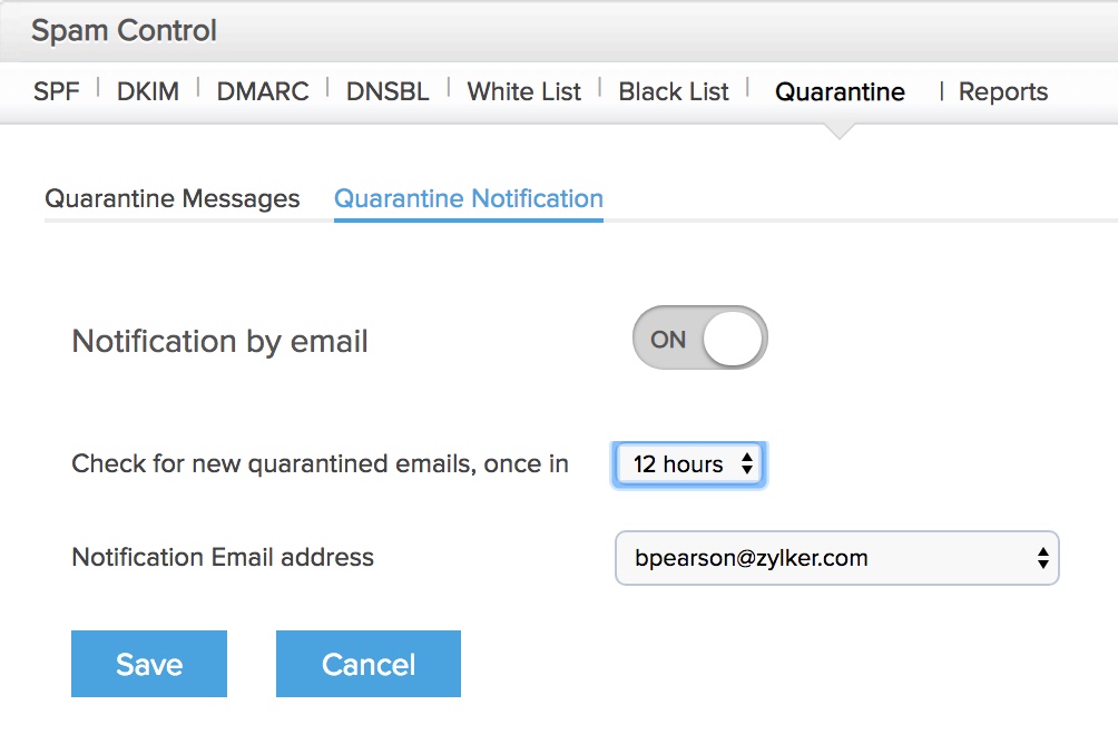 Quando um email é colocado em quarentena devido à falha de qualquer uma das verificações de spam, um email de notificação será acionado. Este e-mail será enviado ao destinatário para quem o e-mail em quarentena é enviado e uma cópia será enviada para um dos administradores selecionados.