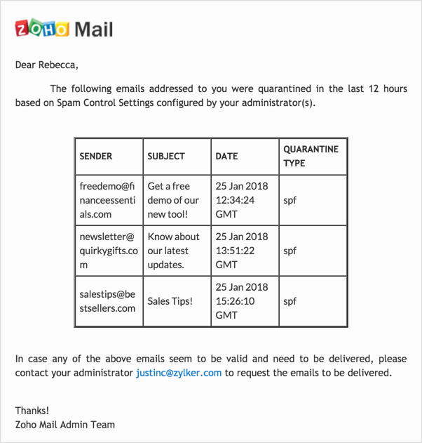 A Quarentena é a seção na qual os e-mails, que podem ser considerados como Spam devido a falha de validação SPF / DKIM ou baseados em Organização ou Zoho Blacklist, podem ser movidos opcionalmente para revisão pelo administrador com base no Antispam.