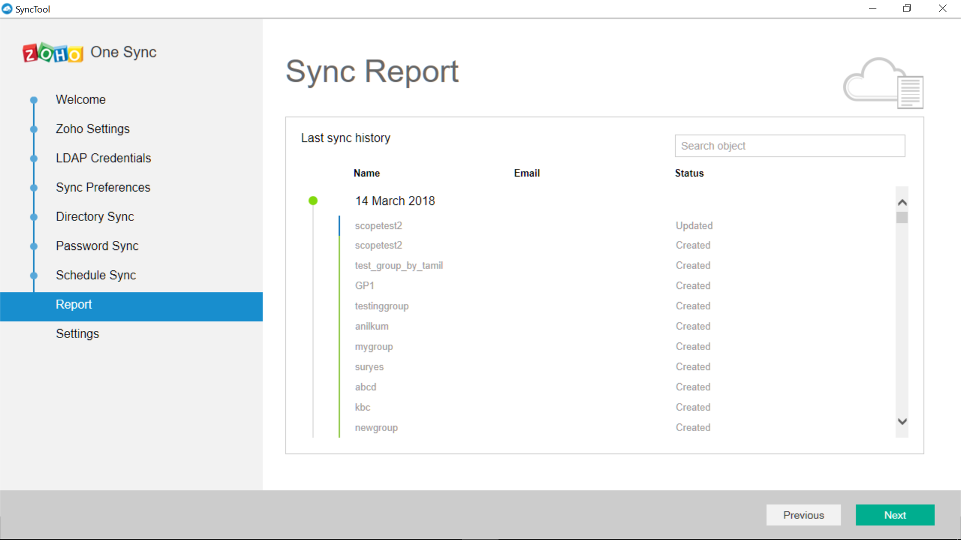 Em Relatórios, você pode ver o histórico de todas as suas sincronizações anteriores. O relatório exibirá o nome de usuário e seu endereço de e-mail junto com o status da sincronização.