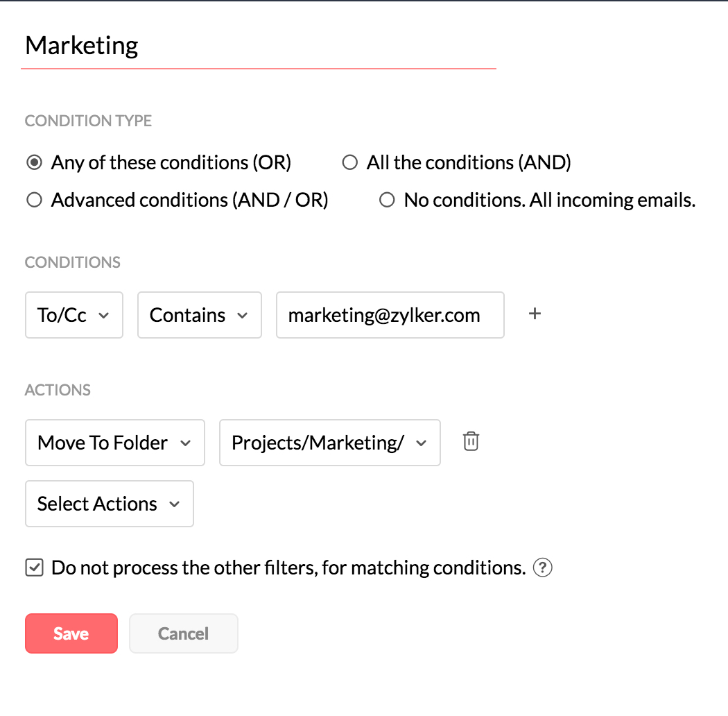 Os filtros de saída no Zoho Mail permitem que você organize seus e-mails enviados. Ele também ajudará você a executar automaticamente determinadas ações em seus e-mails enviados.