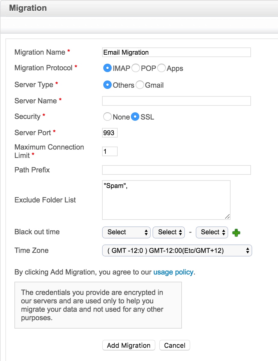 Para ambas as Migração POP / IMAP, os seguintes detalhes são necessários.