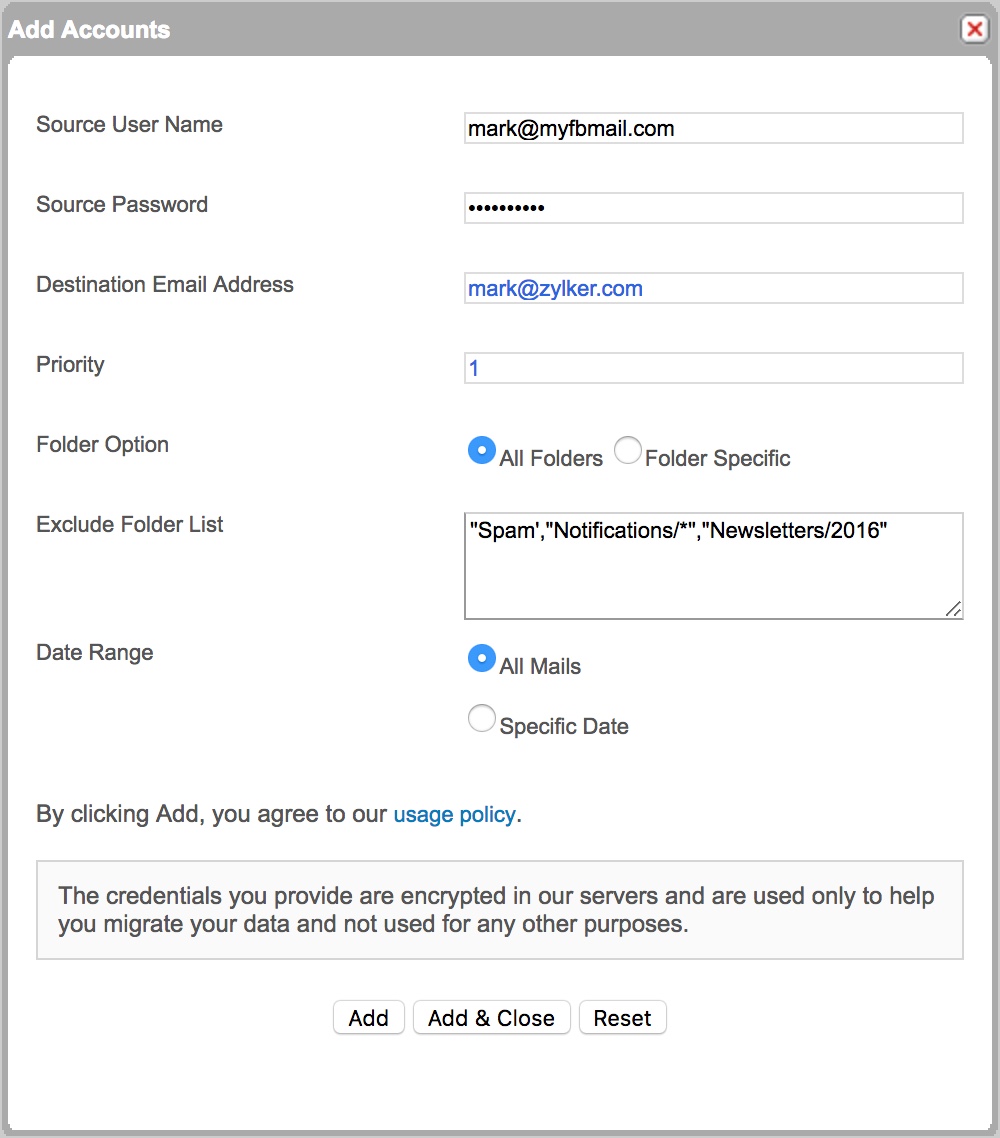 Você pode adicionar as contas manualmente ou importar os detalhes de um arquivo CSV. No entanto, verifique se você tem os detalhes da fonte e da conta de destino prontos. Para cada usuário adicionado, as credenciais de origem são verificadas com o servidor e o usuário é adicionado somente se a autenticação de origem for bem-sucedida.