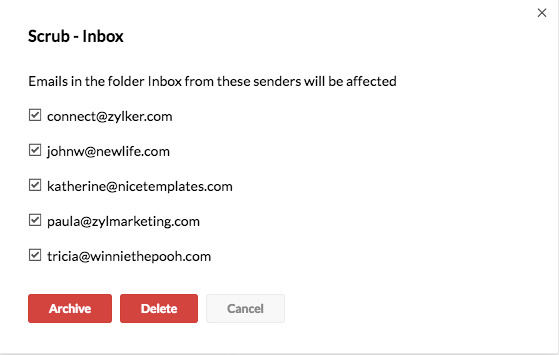 O recurso Scrub ajuda você a ter uma Caixa de entrada desordenada, permitindo que você exclua / arquive os e-mails de vários remetentes em uma única etapa. O recurso Scrub funciona com base no remetente dos e-mails e pode ser usado para até 5 remetentes. Quando há muitos e-mails do mesmo conjunto de remetentes, você pode arquivá-los ou excluí-los da pasta específica.
